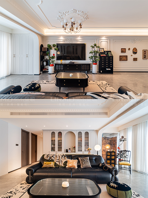 全屋以奶油白为主色调,焦糖色和黑色作为点缀。墙面使用石膏角花和线条装饰,增添贵气。