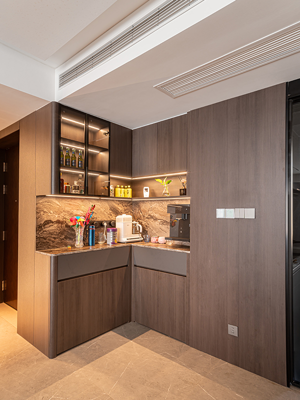 柜体选烟熏尤加利+肤感象牙灰,木纹中和冷感,摸上去温温润润;肤感门耐脏好擦,颜值实用双在线