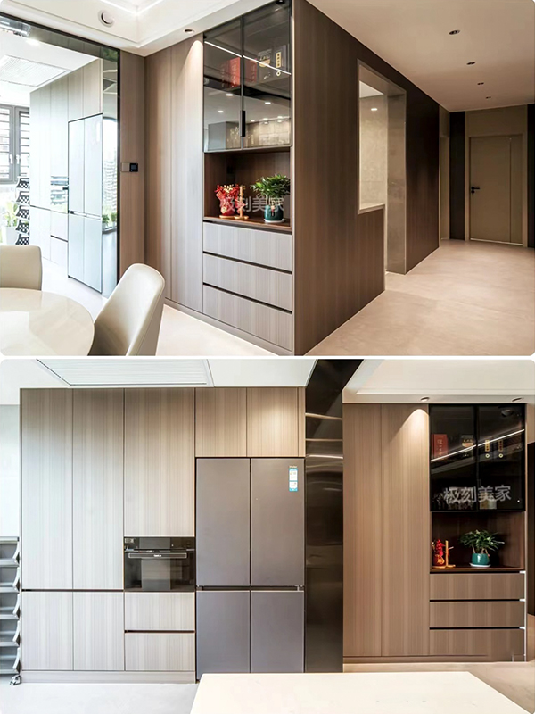 全屋高端定制:柜体板材18厚杉木实芯板,柜门有pet肤感、高光、超晶、五金使用原装进口奥地利百隆五金