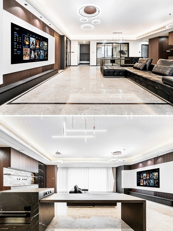 餐厅、书柜处采用仿石材岩板,更具性价比,圆弧悬浮背景墙,圆弧见光面等在其中起到了安全与美观的结合。