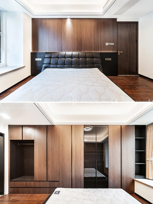 主卧摈弃转交衣帽间,采取床尾柜更加大气,背景墙也有增加氛围感的作用。
