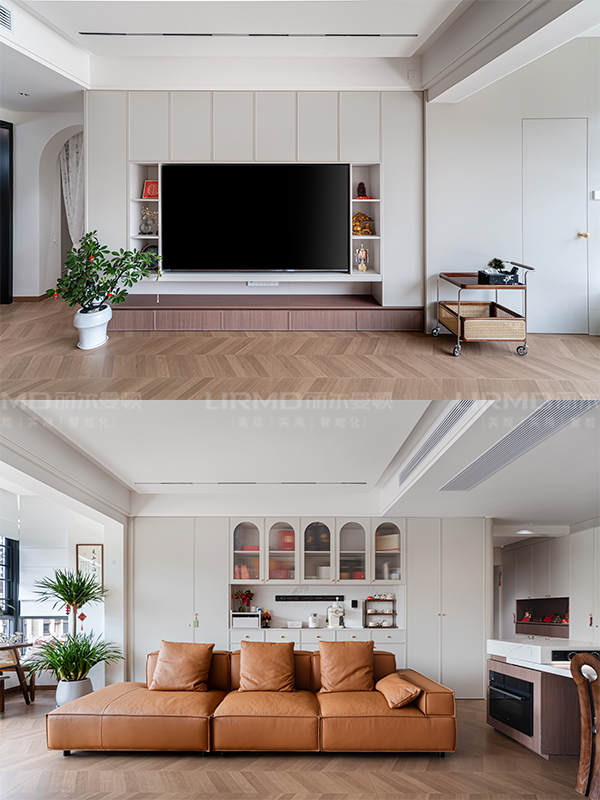 客厅无主灯吊顶,筒灯照明很有氛围感。顶梁用圆弧包覆过渡,柔和空间。