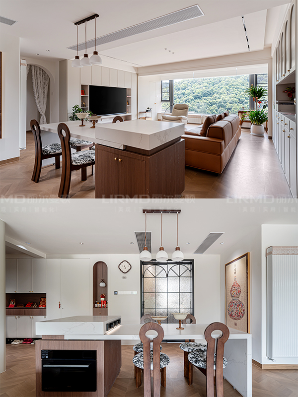 暖棕皮质沙发和鱼骨木纹瓷砖地板颜色搭配,法式岛台嵌入蒸烤箱,空间利用超强。