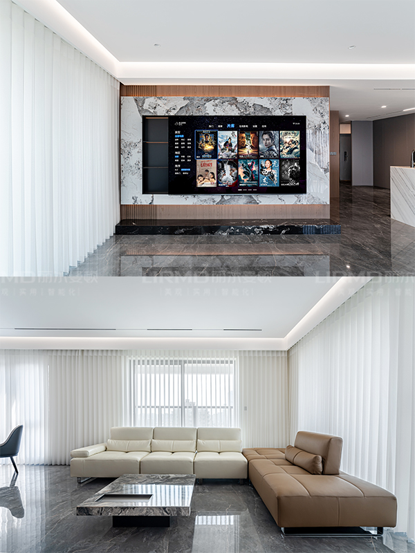 电视背景墙悬浮式岩板设计,灰色和棕色硬装饰面结合作为轻奢基调