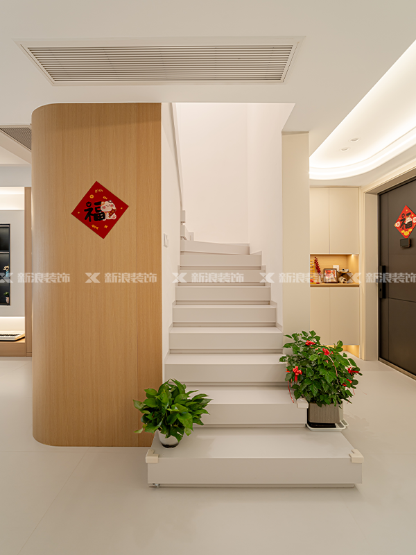 复式楼楼梯边墙和吊顶相呼应做大圆弧角,空间过度更显柔和。